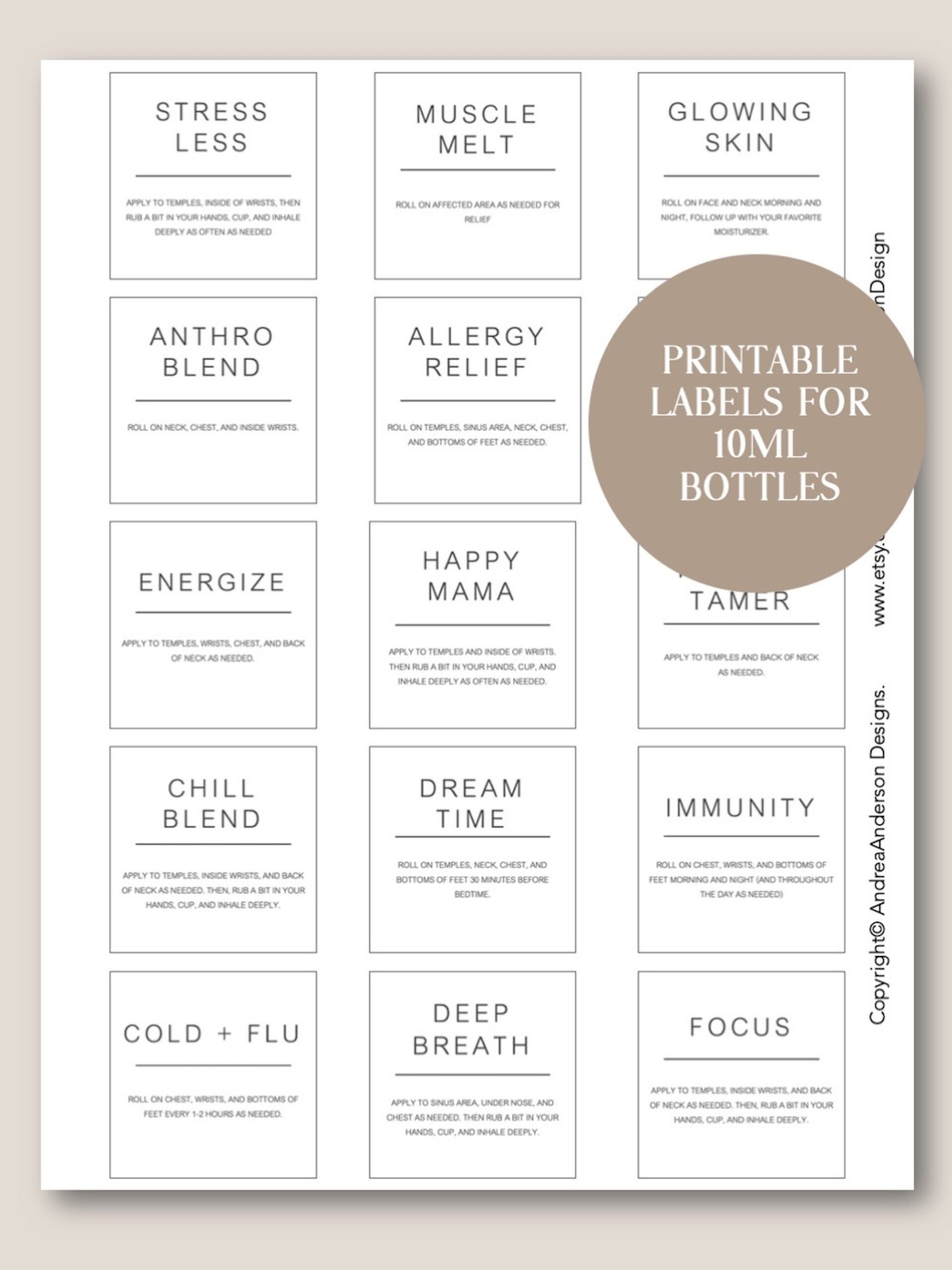 PRINTABLE Essential Oil 10ml Roller Bottle Labels Minimalist Essential Oil Label DIY Essential Oil Gift Printable Essential Oil Label