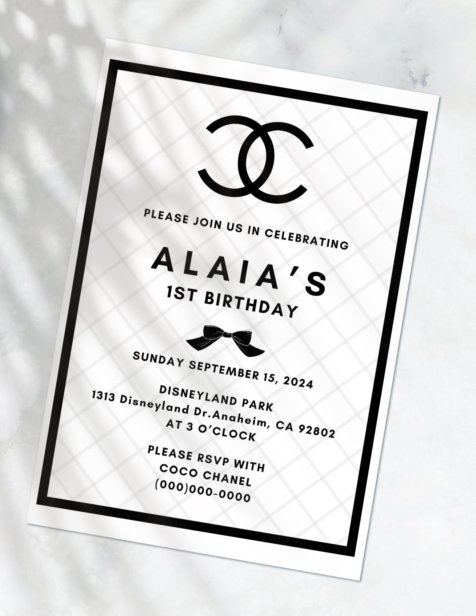 Whether you’re hosting a birthday celebration, bridal shower, or any other special event, our Chanel-inspired invitation is sure to impress your guests. The classic black and white design, along with the iconic double C logo, will make your invitation stand out.
