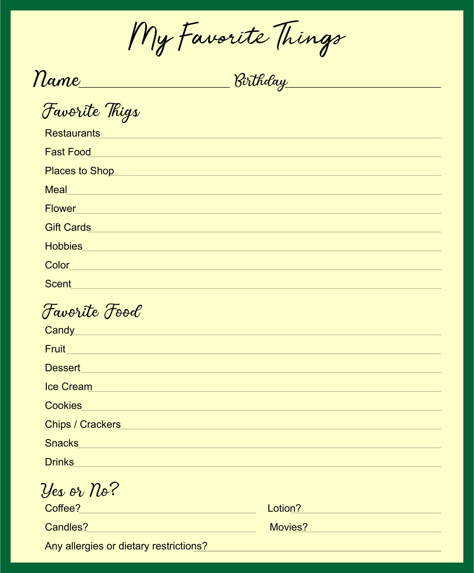 Having a list of favorite things can also be helpful for team events, gift exchanges, or celebrations. Knowing what your coworkers enjoy can make it easier to choose thoughtful gifts or plan activities that everyone will enjoy. It shows that you care about their preferences and want to make them feel valued.
