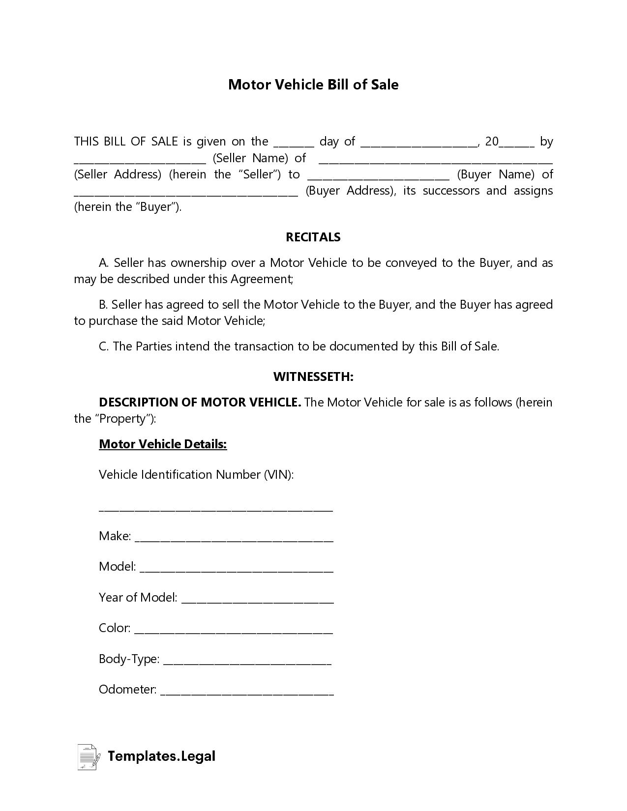 Car Motor Vehicle Bill Of Sale Templates Free Word PDF ODT