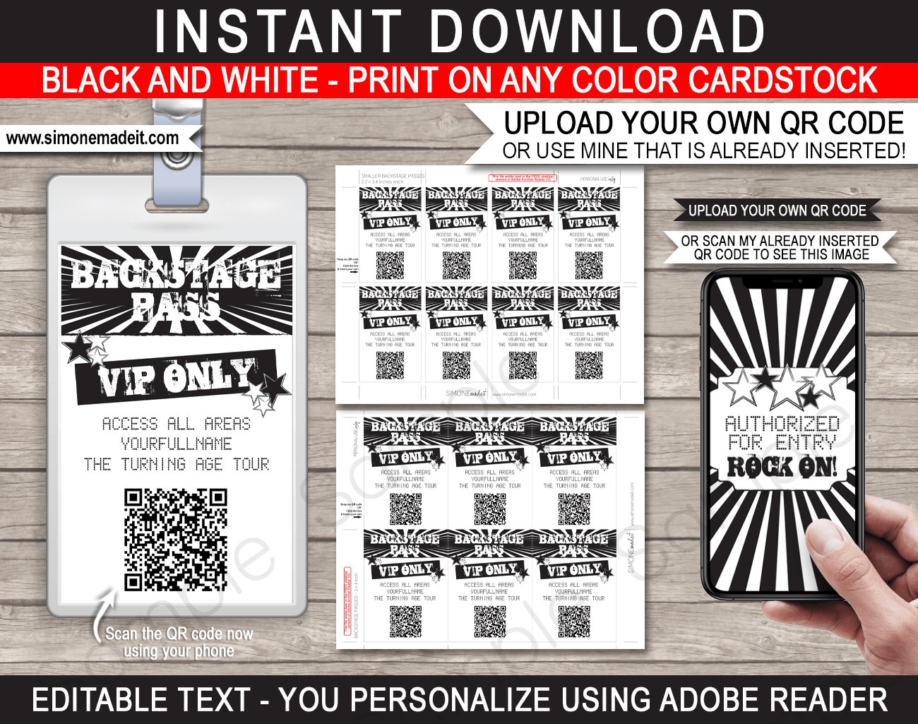 Backstage Pass Template Printable Rock Star Theme Birthday Party Decorations VIP Pass QR Code Instant DOWNLOAD Text Editable Etsy