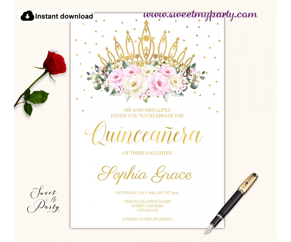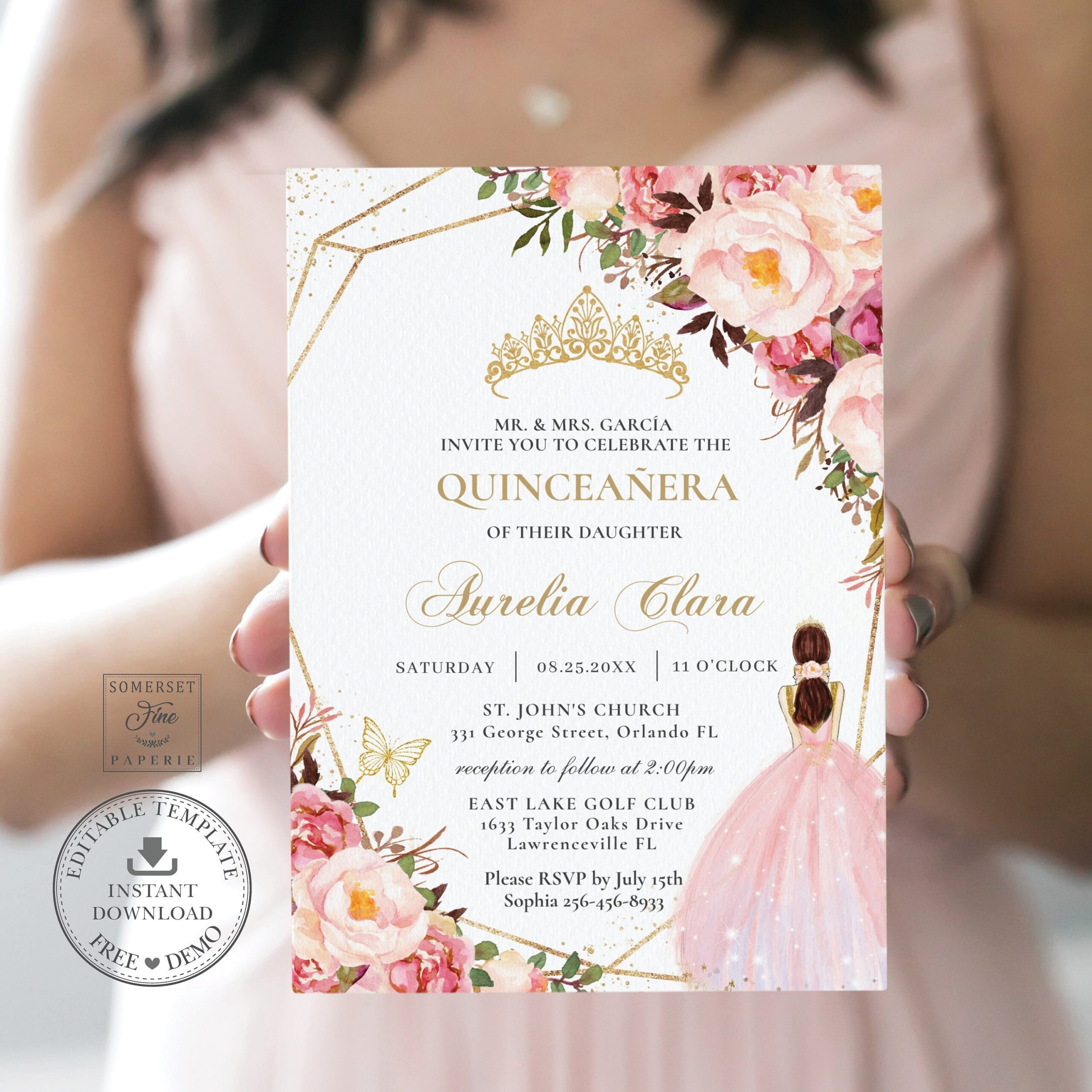 Chic Blush Pink Floral Princess Quincea era Invitation EDITABLE TEMPLATE Mis Quince 15 Anos Birthday Instant Download PDF Printable QC12 Etsy
